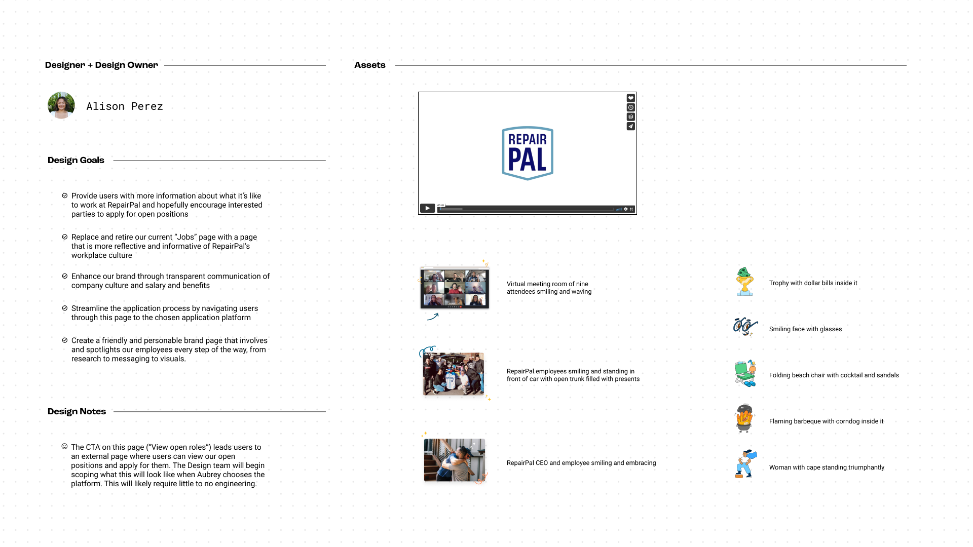 I had a few ideas of overarching themes for the page to start with: working remotely, employee-led initiatives and passion projects, and opportunities for professional development. I first conducted internal research to gather content and messaging based around these themes. I went back and forth between setting up interviews or conducting a survey, and ultimately decided that a survey would give me wide breadth of responses and that that would serve me best (with the option for interviews if I really found that the page design could benefit from them). With help from our UX Researcher Shreya Venkatesan, I created a comprehensive internal survey with questions regarding each of the themes I mentioned above. From the responses I received, I was able to gather testimonials and focus on the most unique and compelling qualities of working at RepairPal.